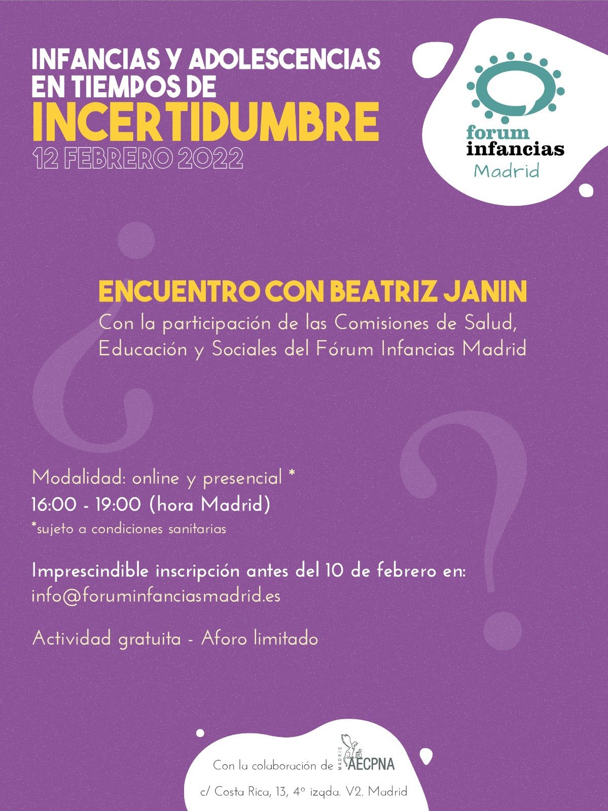 El pasado 12 de febrero de 2022 tuvo lugar en la sede de ACEPNA la II Jornada de Fórum Infancias Madrid: «Infancias y adolescencias en tiempos de incertidumbre». Fue un espacio de reflexión en el que pudimos disfrutar de una ponencia de Beatriz Janin así como de las diferentes intervenciones de las comisiones de clínica, educación y social del Fórum Infancias Madrid. En breve contaremos con la documentación del Encuentro. Ya tenemos disponible el vídeo del encuentro, para aquellxs que quieran disfrutarlo en diferido: