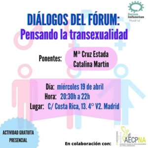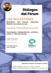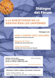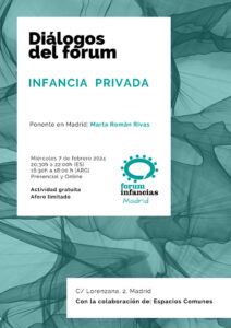 Invitamos a personas de diferentes disciplinas a una mesa de diálogo con miembros del Fórum Infancias Madrid para ahondar una temática de actualidad desde distintas perspectivas. En una segunda parte trabajamos con los asistentes temáticas derivadas de la mesa de diálogo.