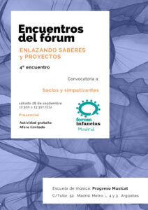 Nos reunimos para pensar juntos sobre situaciones en las distintas realidades clínicas, educativas y sociales donde estamos, y así surgen intercambios, nuevos interrogantes y propuestas de posicionamiento del Fórum Infancias Madrid.