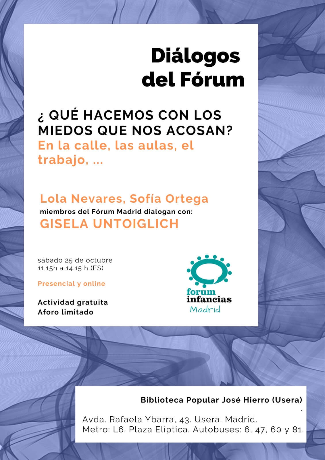 Volvemos con los diálogos del Fórum. Esta vez conversamos con Gabriela Untoiglich sobre los miedos. Tendrá lugar el próximo sábado 25 de octubre en la Biblioteca popular José Hierro (Usera). Apuntante aquí