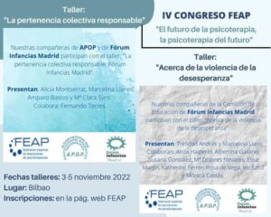 El Fórum Infancias Madrid ha estado presente en Encuentros Internacionales del Fórum Infancias, así como en presentaciones de libros de socios. Hemos participado en distintos congresos nacionales e internacionales, y en cursos de formación de la red pública. También fuimos invitados a programas de radio.